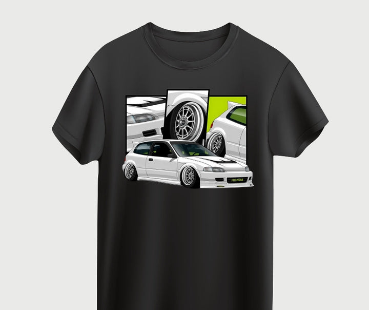 Celebrate the iconic JDM culture with this sleek Honda hatchback graphic tee. Featuring a detailed, multi-frame design with lowered stance, alloy wheels, and clean white bodywork — this shirt is a tribute to real car passion. Printed on premium-quality fabric, it's made for streetwear lovers and car scene fans alike.