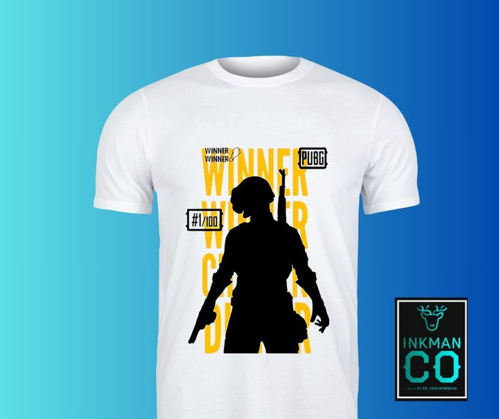 Celebrate every clutch victory with our bold PUBG-themed t-shirt featuring the iconic “Winner Winner Chicken Dinner” slogan. A striking black silhouette of a fully-geared soldier stands against yellow stacked typography — perfect for players who dominate the battleground.